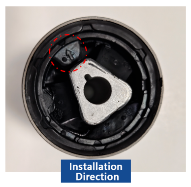 설치하는 동안 부싱의 단단한(비분할) 부분이 차량 주행의 수평 전방 방향과 정렬되어 있는지 확인하십시오. 부싱에 방향 화살표가 있는 경우 이 화살표는 이동 방향의 앞쪽을 가리켜야 합니다.